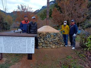 この一里塚は、肥中街道連絡協議会会員の小田村さんが 独力で建立されました。 長い年月をかけて一里塚の文献調査、塚石の運搬組上げ、塚木の製作など 大変なご苦労を経て見事な一里塚が出来上がりました。 国道435号、四ノ瀬バス停の近くにその塚は立っています。