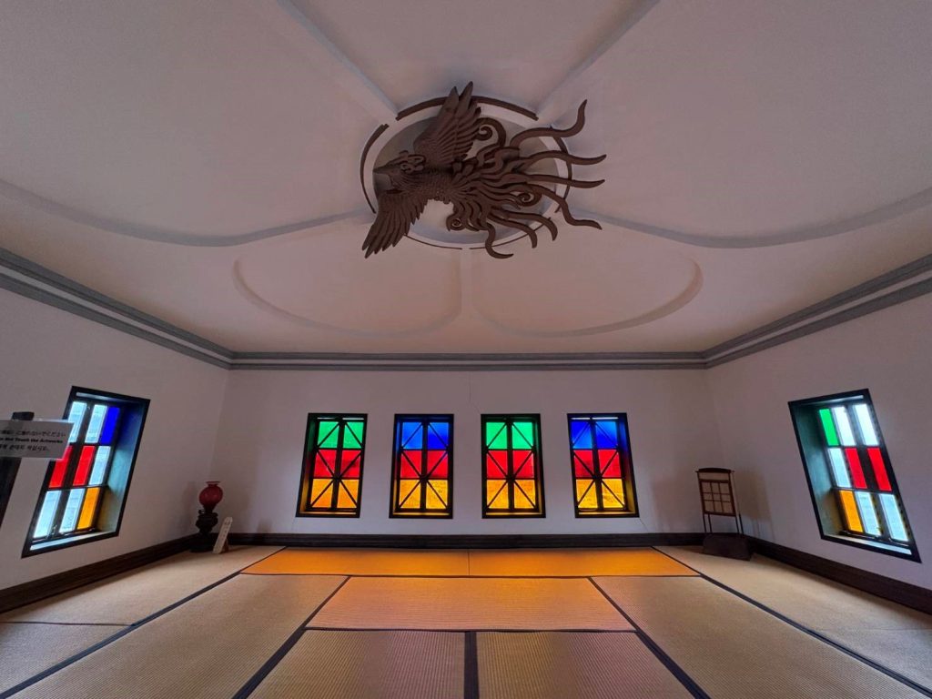 重要文化財「四階楼」は明治12年廻船問屋小方謙九郎が発注した和洋折衷の木造建物です。 フランスからステンドグラスを輸入し自在に使いこなしていることに参加者の皆さん感心しきりでした。