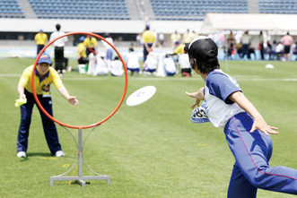 フリスビーを投げて、輪っかの的を通します。パワーもスピードもいらないですが、平常心で投げるハートの強さが大事かも!?