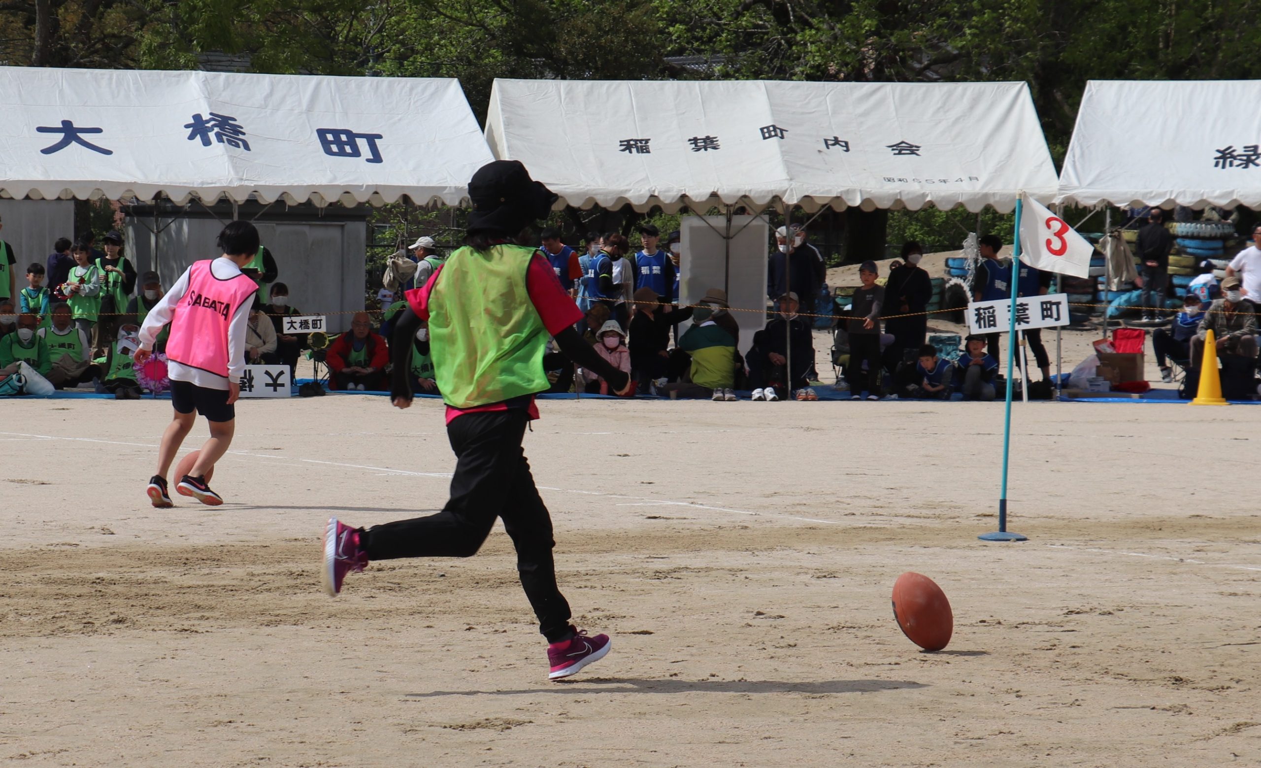 バトンではなく、ラグビーボールを蹴って4人がリレーをします。