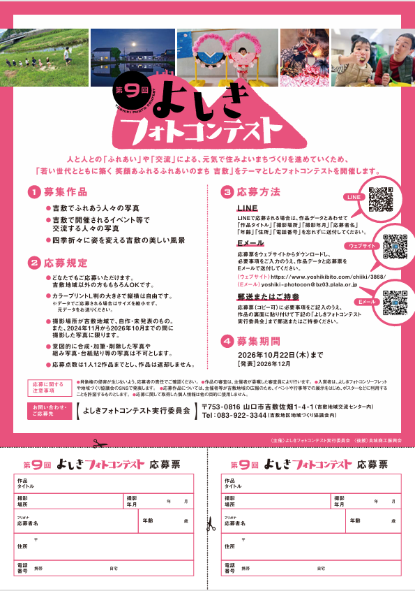 人と人との「ふれあい」や「交流」による、元気で住みよいまちづくりを進めていくため、「若い世代ととに築く 笑顔あふれるふれあいのまち 吉敷」をテーマとしたフォトコンテストを開催しています。